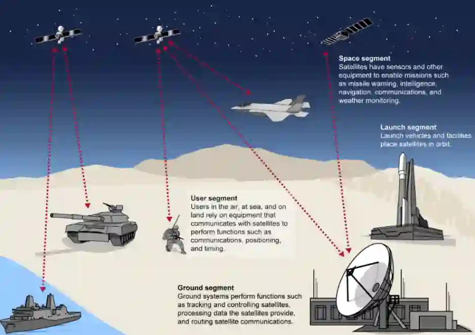 图3-典型的空间系统部分[16]。在运行上(即发射后),三个相关部分是地面、空间和用户部分。