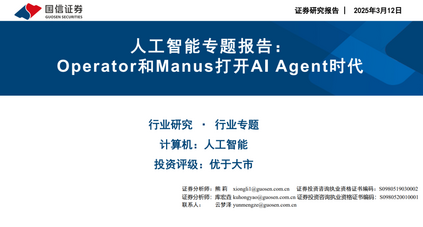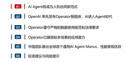 AI Agent是人机交互新范式。AI Agent是能够感知环境、进行决策、执行动作的智能体,在2023已顺应大模型浪潮而生,随着多模态等技术逐步成熟,当前各厂商持续推出相关产品,Agent已开始逐步进入各个场景的工作流中,成为人机协同新范式。根据Roots Analysis预测数据,预计24年全球AI Agent市场规模为52.9亿美金,预计2035年达到2168亿美金,对应24-35年CAGR为40.15%。 OpenAI推出Operator,AI正式迈入Agent时代。Operator由CUA新模型提供支持,其通过强化学习实现了GPT-4o的视觉能力与高级推理相结合,可以像人类一样完成与图形用户界面(GUI)的交互。Operator运行在浏览器中,在云端构建虚拟环境来执行操作,工作步骤主要分为感知、推理、执行。当前Operator测试数据优于前期SOTA,但与人类差距仍较大,目前仍在快速进步中。 Operator遵守严格的数据使用和法律要求。OpenAI在数据使用上,除了公开和用户提供的信息之外,还有较多的第三方公司合作。美国法律对OpenAI在数据访问的隐私保护、数据安全、版权、特定领域数据保护等均有要求,Operator也提供了较为严格的安全措施。 Operator在多个场景应用已逐步显示潜力。Operator的一些典型应用场景包括:旅行预订、购物、餐厅预订、行政任务、市场营销、与 各行业合作。OpenAI正与DoorDash、Instacart、OpenTable和Priceline等公司合作,以改进Operator在现实世界中的应用。 中国团队推出全球首个通用AI Agent Manus,性能表现优异,与阿里千万达到合作。Manus定位为全球第一款通用Agen,面对各类复杂多变的任务,Manus在自己的虚拟环境中灵活调用各类工具——编写并执行代码、智能浏览网页、操作各类网页应用——目标为用户直接交付完整的任务成果。在官方演示中,Manus展现了其筛选简历、遴选房产、股票分析等多种应用场景。在GAIA基准测试中,Manus在所有三个难度级别上都取得了新的最先进(SOTA)表现。目前Manus平台宣布将与阿里通义千问团队正式达成战略合作。