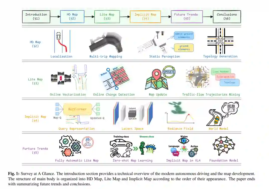 地图一直是自动驾驶的重要组成部分。随着自动驾驶技术的进步,地图的表示方式和生产流程都发生了显著演变。本文将地图的发展划分为三个阶段:高精地图(High-Definition, HD maps)、轻量地图(Lite maps)以及隐式地图(Implicit maps)。针对每个阶段,我们对地图生产的工作流程进行了全面回顾,重点突出了其中的技术挑战,并总结了学术界提出的相关解决方案。此外,我们还讨论了地图表示的前沿研究进展,并探讨了如何将这些创新融入端到端的自动驾驶框架中。 关键词:自动驾驶,高精地图,轻量地图,隐式地图 地图长期以来一直是驾驶的重要组成部分,为导航与决策提供关键的空间信息。在人工驾驶场景中,标准精度地图(Standard-Definition, SD maps,通常称为导航地图)通常已经足够。这类地图一般包含道路层级结构和交通规则,能够为基本路径规划提供指导,而无需精确到车道级的细节信息。人类驾驶员主要依赖自身的感知与推理能力,在 SD 地图的辅助下完成驾驶。 然而,在自动驾驶(Autonomous Driving, AD)中,对地图精度与丰富度的要求显著提升。自动驾驶车辆高度依赖高精地图(High-Definition, HD maps),这类地图提供了丰富的厘米级车道信息,包括道路几何形状、车道边界、交通信号、语义地标,甚至是道路表面特征。高精地图充当了先验知识库,在提升定位精度、支持感知系统、为预测模型提供输入以及确保规划符合法规等方面发挥着关键作用。 尽管作用重大,高精地图也存在明显局限:其生产成本高昂,往往需要人工标注和专用测绘车辆;更新周期缓慢且维护成本高,从而限制了其可扩展性。为应对这些挑战,轻量地图(Lite maps)作为一种有前景的替代方案应运而生。轻量地图保留了必要的车道级信息,但通过众包数据和自动化生成技术显著降低了生产成本,并支持更高频率的更新,为真实场景中的自动驾驶部署提供了一种更具可扩展性与实用性的解决方案。 更近期的演进方向是隐式地图(Implicit maps)的发展,这与端到端自动驾驶系统的趋势保持一致。与存储显式的几何与语义元素不同,隐式地图将空间和行为先验直接编码到神经网络表征中。这类学习到的表征可以融入感知、预测与规划模块,实现可微分处理与反向传播,这对于联合学习系统至关重要。这一范式的目标是开发出不仅能够支持驾驶任务,还能促进自动驾驶车辆实现更类人、更具上下文感知的决策的地图表示。 在本综述中,我们系统回顾了自动驾驶中的地图研究。图 1 给出了本文的整体框架。我们首先介绍地图在自动驾驶系统中的集成方式以及产业界的发展历程。正文主体分为四个核心部分:高精地图、轻量地图、隐式地图以及未来趋势,按照地图发展的时间顺序展开。在每个阶段中,我们都会讨论所面临的挑战并回顾相关研究工作: 1. 高精地图部分:聚焦于定位、多次采集建图、静态感知与拓扑生成; 1. 轻量地图部分:强调在线矢量化、变化检测、地图更新与交通流轨迹挖掘; 1. 隐式地图部分:探讨不同类型的隐式表示与世界模型; 1. 未来趋势部分:讨论新兴方向,包括全自动轻量地图、零样本地图学习、视觉-语言-行动模型以及基础模型。