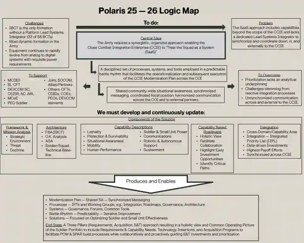 为实现转型目标,CCIE必须优先整合时间、资金及人力等资源,最大化步兵旅战斗队(IBCT)的战斗力增益。这要求装备研发与作战条令创新双轨并行,以实战化多域作战(MDO)能力确保陆军持续保持战场主导权。"北极星25—26"重点标注了下一代系统、全域特征管理、态势感知增强、机器人及自主系统等关键发展领域。