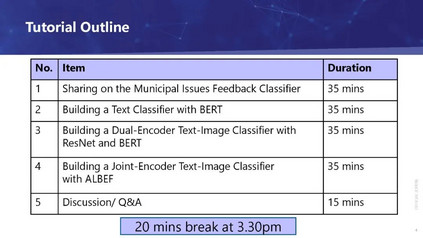在我们的社会中,多模态数据的日益流行导致了对机器的需求增加,以全面地理解这些数据。然而,渴望研究此类数据的数据科学家和机器学习工程师面临着从现有教程中融合知识的挑战,这些教程通常单独处理每个模态。根据我们在新加坡政府对多模态城市问题反馈进行分类的经验,我们进行了一个手工教程,以希望将机器学习应用于多模态数据。 2021年,作为新加坡政府国家人工智能战略计划的一部分,新加坡政府技术机构(GovTech)的数据科学和人工智能部门(DSAID)构建了一个反馈分析引擎[1],根据市政问题反馈,该引擎可以预测: