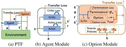 深度强化学习解决很多复杂问题的能力已经有目共睹,然而,如何提升其学习效率是目前面临的主要问题之一。现有的很多方法已验证迁移学习可利用相关任务中获得的先验知识来加快强化学习任务的学习效率。然而,这些方法需要明确计算任务之间的相似度,或者只能选择一个适合的源策略,并利用它提供针对目标任务的指导性探索。目前仍缺少如何不显式的计算策略间相似性,自适应的利用源策略中的先验知识的方法。本文提出了一种通用的策略迁移框架(PTF),利用上述思想实现高效的强化学习。PTF通过将多策略迁移过程建模为选项(option)学习,option判断何时和哪种源策略最适合重用,何时终止该策略的重用。如图1所示,PTF分为两个子模块,智能体(agent)模块和option模块。Agent模块负责与环境交互,并根据环境的经验和option的指导进行策略更新。