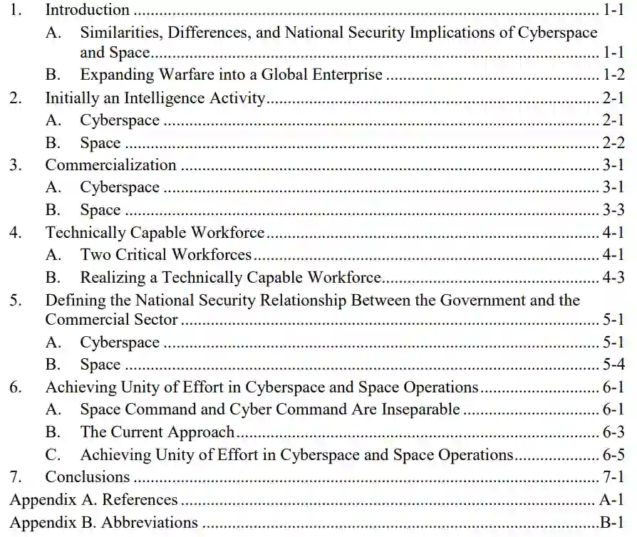 其中三个问题涉及:(a) 确定政府与商业部门在每个领域的国家安全关系;(b) 招募、专业发展和留住有技术能力的劳动力;(c) 在每个领域内部和两者之间实现统一行动,包括确定美国网络司令部(CCB)与美国太空总署(NASA)之间的适当关系。 这包括确定美国网络司令部(CYBERCOM)与国家安全局(NSA)之间、美国太空司令部(SPACECOM)与国家侦察局(NRO)之间以及美国网络司令部和太空司令部与地域和职能作战司令部(CCMDs)之间的适当关系。