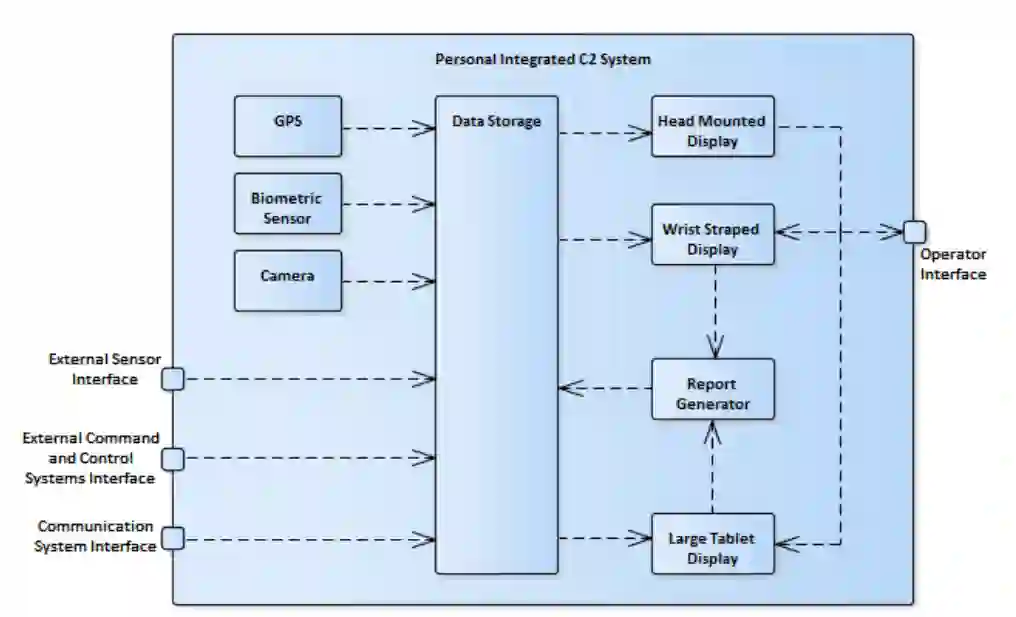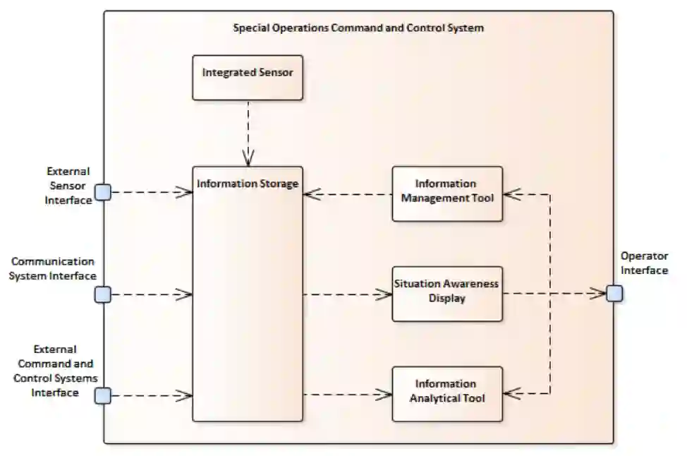 C2系统将着重于界面(如显示器)和信息处理元素,这些元素将被部署在操作人员和他们的指挥官身上。通信系统被看作是C2系统的外部。通信是C2系统的一个促成因素。它通常由外部单位控制,并由其他人用于不同的目的。C2系统还需要与部署在特种作战人员身边的外部传感器相连接。为了使特种作战C2系统支持实施协作或边缘C2方法,将需要有效的通信接口和互操作性。