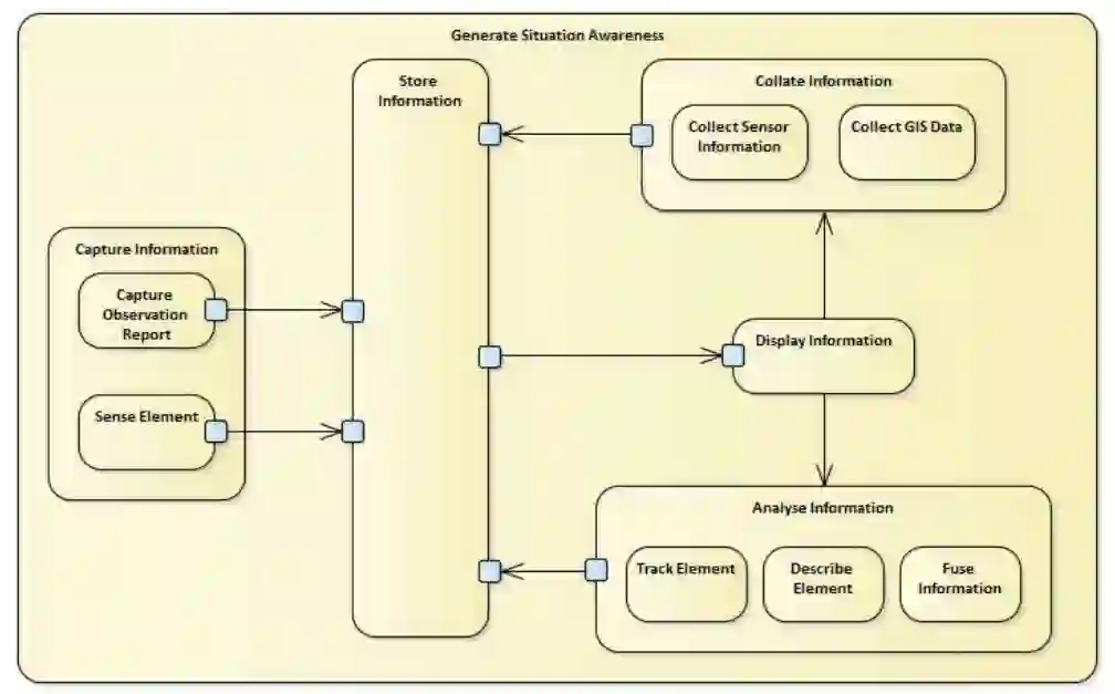 这些信息被储存起来用于显示和分析。选定的信息要显示给操作人员,以便为指挥官提供一个完整的战斗空间图,以及命令、回应和协调行动的能力。另一个关键方面是分析信息,以提高捕获信息的价值和可用性。同样,端口被用来定义各项活动之间的接口。