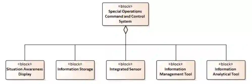 本节实现了图2中的过程,为特种作战定义了一个概念解决方案C2系统。这是在MBSE工具Enterprise Architect™中用SysML生成模型的一些视图来完成的。为了说明问题,我们将只提供有限数量的模型输出图。本节提供的信息将支持下一节的建模方法的演示,以定义一个可能需要用于特种作战的通用C2系统。本节提供的信息将支持下一节中的建模方法的演示,以定义一个可能需要用于特种作战的通用C2系统。