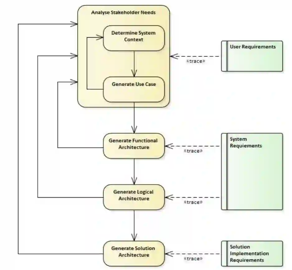 解决方案架构是这个建模过程的输出,并将被用来得出系统的功能、接口、数据和性能要求。一些解决方案可能会被生成,以输入到方案选择过程中。根据合同准则,需求可能会以文本形式或模型库的形式输出。