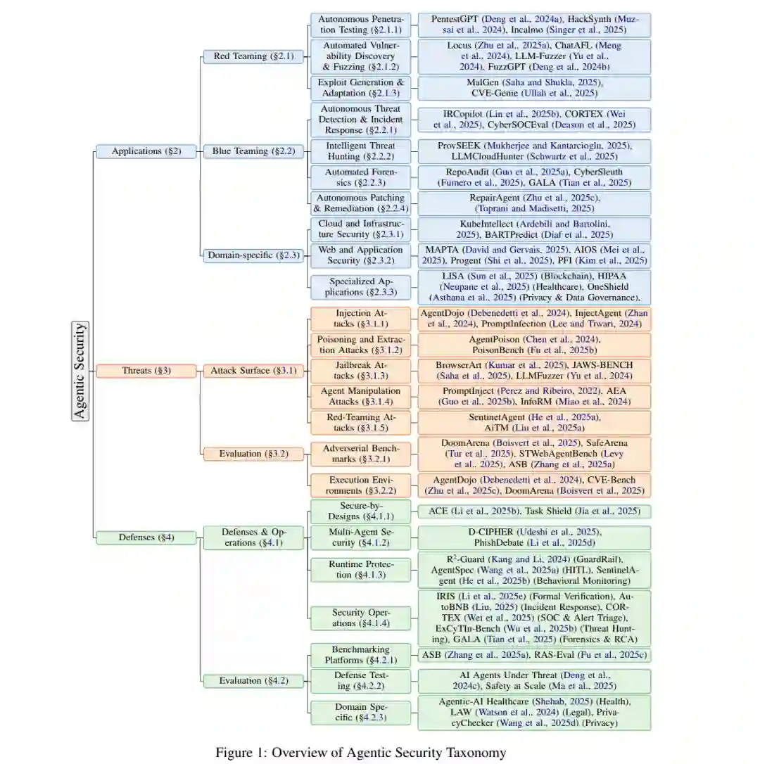 我们将 LLM 智能体定义为:其核心决策模块为 LLM,能够进行规划,调用工具/API,并在外部环境中采取行动;同时观察反馈并据此调整后续动作。它维护状态(短/长时记忆或知识库),并可能包含显式的自我反思/自验证与治理层,以满足任务目标与安全约束。 这种新获得的“能动性”使 LLM-智能体在安全谱系上展现出惊人的能力(Shen 等,2025;Zhu 等,2025b;Lin 等,2025b)。然而,多项研究表明,仅仅将 LLM 包装进智能体框架这一行为,就会显著增加其脆弱性(Saha 等,2025;Kumar 等,2025;Chiang 等,2025)。对此,越来越多的研究着手提出对策以加固这些系统(Debenedetti 等,2025;Udeshi 等,2025)。 智能体安全研究的快速发展——仅 2024–2025 年间就有 150 余篇论文——造成了缺乏系统综合的碎片化格局。现有综述虽分别在安全威胁(Deng 等,2024c)、可信性(Yu 等,2025)、企业治理(Raza 等,2025)与核心 LLM 安全(Ma 等,2025)等具体方面提供了有价值的洞见,但如表 1 所示,它们未能呈现全景图。这种碎片化使实践者与研究者缺乏一个统一框架来理解智能体的能力、脆弱性与防御之间如何相互关联。 在本文中,我们提出首个关于智能体安全版图的全景式综述,并围绕安全研究者最关心的三个问题加以结构化:**“智能体能为我的安全做什么?”(应用),“它们会如何被攻击?”(威胁),以及“我如何阻止它们?”(防御)。**为此,我们定义了三大分类支柱: * 应用(§2):在下游网络安全任务中使用 LLM-智能体,包括红队(自主式漏洞发现)、蓝队(威胁防御)与特定领域安全(云、Web 等)。 * 威胁(§3):智能体系统所固有、可被攻击者利用的安全脆弱性。 * 防御(§4):用于抵御上述威胁、加固智能体系统的技术与对策。