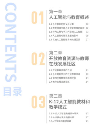 第二至五章分别介绍了全球K-12人工智能支撑环境中各要素情况。其中,第二章介绍了开放教育资源与教师在线发展社区,分析了使用开放教育资源的好处,举例介绍了部分人工智能学习平台以及教师在线发展社区。第三章对K-12人工智能教材读本的现状进行总结,介绍了不同年龄段的人工智能教材读本的内容选择,并介绍了部分人工智能教学实践。第四章介绍了K-12人工智能算法及算法教学中面临的挑战与展望,对算法教学中可能涉及到的数据集进行了梳理与总结。第五章介绍了人工智能教学实验室的分类及特点,并列举了部分教学实验室案例。