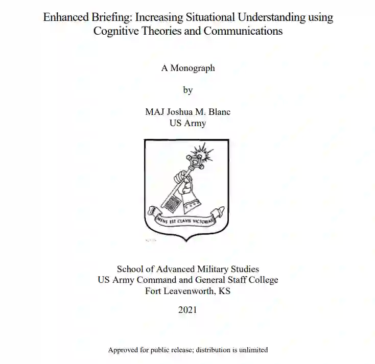 本专著的研究方法包括三个主要的重点领域:学说、认知理论和交流。对理论进行了评估,形成了对作为决策者的指挥官、参谋部和情报专业人员角色内核理解。我们研究了知识管理的演变,以建立对形势的理解和指挥官的可视化,作战流程,以及交流和军事简报中的理论缺陷。本节的结论是,通过纳入认知理论,同情报专业人员的提高联系起来,这些理论包括:思考、学习、学习误区、双重编码理论、认知负荷理论和自然主义决策理论。交流所研究的内容包括:理论、过程和方法,以及关于修辞、信息背景、简洁、说服力和影响力、常用词汇以及视觉呈现元素等额外细节。情报专业人员了解认知理论和交流的意义将通过有影响力的信息传递来促进学习。改善组织内简报的方法为采用用口头和视觉演示的形式,进一步丰富对态势的理解,以便在日益复杂的多领域环境中做出更快、更有效的决策。