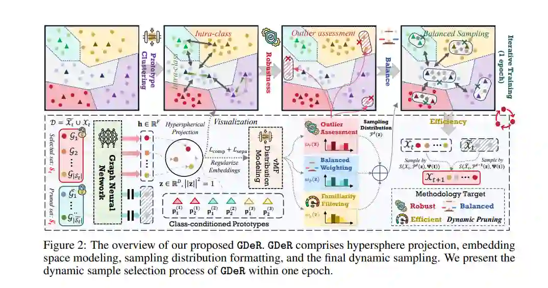 训练高质量的深度模型需要大量的数据,这会导致巨大的计算和内存需求。近年来,数据剪枝、蒸馏和核心集选择等方法被开发出来,以通过保留、合成或从完整数据集中选择一个小而信息丰富的子集来简化数据量。在这些方法中,数据剪枝带来的额外训练成本最低,并提供了最实际的加速效果。然而,它也是最脆弱的,往往在数据不平衡或数据模式偏差的情况下遭遇显著的性能下降,因此在设备端部署时,其准确性和可靠性引发了担忧。因此,迫切需要一种新的数据剪枝范式,既能保持现有方法的效率,又能确保平衡性和鲁棒性。与计算机视觉和自然语言处理领域中已开发出成熟的解决方案不同,图神经网络(GNN)在应对日益大规模、不平衡和噪声数据集时仍面临挑战,缺乏统一的数据集剪枝解决方案。 为此,我们提出了一种新的动态软剪枝方法——GDeR,该方法通过可训练的原型在训练过程中动态更新训练“篮子”。GDeR首先构建一个经过良好建模的图嵌入超球体,然后从该嵌入空间中抽取具有代表性、平衡且无偏的子集,达到我们所称的图训练调试(Graph Training Debugging)目标。在五个数据集和三个GNN骨干网络上的广泛实验表明,GDeR (I) 在减少30%至50%的训练样本的情况下,仍能达到或超越完整数据集的性能;(II) 实现了最高2.81倍的无损训练加速;(III) 在不平衡训练和噪声训练场景中,比最新的剪枝方法分别提高了0.3%至4.3%和3.6%至7.8%的性能提升。源代码可在https://github.com/ins1stenc3/GDeR获取。