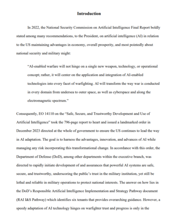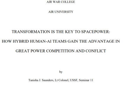 2023 年 12 月,关于安全、可靠和值得信赖地开发和使用人工智能的第 14110 号行政命令,指示整个政府确保美国在利用人工智能的优势、创新和进步方面继续保持领先地位,同时管理纳入这一转型变革的任何风险。美国防部的《负责任的人工智能实施和战略途径》文件为所有部门提供指导和监督,说明如何以及何时将人工智能能力纳入其任务。太空领域的人工智能技术可以增强太空部队执行核心任务的能力,但由于行动的独特性以及人类与人工智能技术配对所产生的额外协同效应,人类与人工智能的团队合作是最大限度发挥人工智能能力的最佳方式。虽然在军事行动中,人类与人工智能的团队合作并不是一个新概念,但要加快行动适应性,必须解决并获得作战人员的信任。