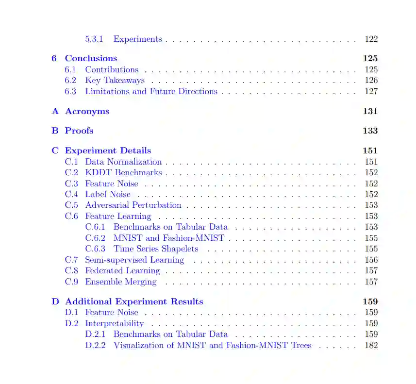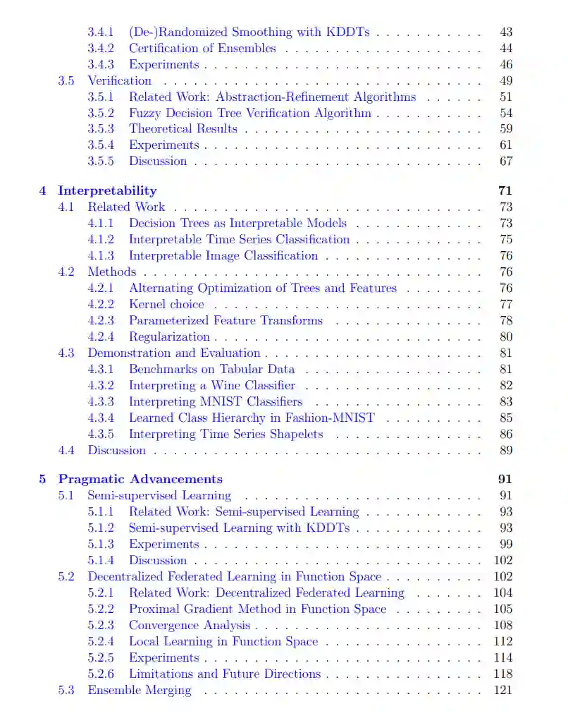 第三支柱是务实的进展。半监督学习(SSL)是由标签成本的高昂而驱动的,从混合的标记和未标记数据中学习。树的半监督学习通常仅限于黑箱包装方法,而这并不适合树。我们提出了一种基于我们对数据的不确定解释的新颖内在SSL方法。联邦学习(FL)是由数据共享限制驱动的,通过通信模型从分布式数据中学习。我们引入了一种基于函数空间正则化的新FL算法,它借用了我们不确定解释形式中的概念和方法。与先前的FL方法不同,它支持非参数模型,并在温和的假设下具有收敛保证。最后,我们展示了我们的FL算法还提供了一种简单的集成合并实用工具。