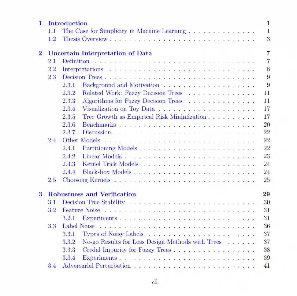 受到人工智能(AI)在高成本和安全关键应用中的潜力,以及最近人工智能在我们日常生活中日益普及的影响,可信赖的人工智能作为一个广泛的研究领域日益受到重视,涵盖了可解释性、鲁棒性、可验证安全、公平性、隐私、问责等主题。这在简单、透明的模型与复杂、黑箱模型之间造成了一种紧张关系,前者具有固有的信任相关好处,而后者在许多任务上的表现则无与伦比。为了弥补这一差距,我们提出并研究了一种对数值数据的不确定解释,并将其应用于基于树的模型,形成了一种新型模糊决策树,称为核密度决策树(KDDTs),它具有更好的性能、增强的可信特性和更广泛的实用性,使得这些树可以应用于更广泛的领域。我们将本论文的贡献分为三大支柱。