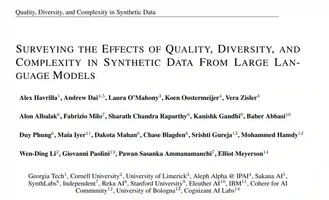 利用大规模语言模型 (LLMs) 生成合成数据已成为增强自然数据的有前景的范式,适用于几乎无限范围的任务。然而,大多数现有的方法都相当临时,利用了广泛的种子数据集、LLMs、提示、过滤器以及特定任务的生成策略。鉴于这种多样性,合成数据生成算法之间的直接比较很少,这使得我们很难理解改进的来源以及存在的瓶颈。为了解决这一问题,我们建议通过评估每个算法生成的合成数据的组成来对算法进行评估。特别地,我们提议检查生成数据的质量、多样性和复杂性 (QDC)。选择这三个数据特征是因为它们在开放式过程中的重要性,以及每个特征对下游模型能力的影响。我们发现质量对模型在分布内的泛化至关重要,多样性对分布外泛化至关重要,而复杂性对两者都有益。此外,我们强调了训练数据中质量与多样性的权衡及其对模型性能的下游影响。
