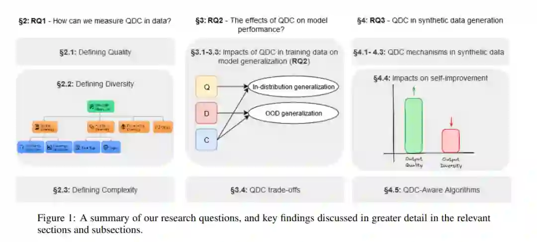 本综述补充了上述关于合成数据生成、开放性和质量多样性(QD)的方法的观点。我们将这些研究结果结合起来,形成了一个更广泛的视角,探讨未来数据生成和选择的工作如何从不同领域中衍生出来。我们通过提供一个质量、多样性和复杂性的框架,来对合成数据进行分类,从而更好地理解合成数据生成过程中的权衡和低效问题。我们用具体的经验总结和最佳实践来支持这一框架,涵盖了流行领域,包括预训练、指令调优和推理。最后,我们提供了一份开放问题和未来研究方向的清单,以便更好地理解合成数据生成与QDC之间的交集。上述对现有工作的总结突出了本综述所填补的重要空白。