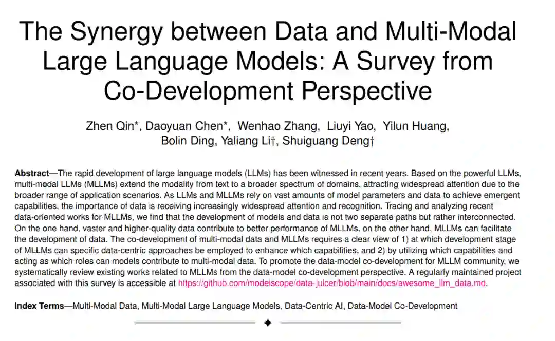 近年来,我们见证了大型语言模型(LLM)的快速发展。基于强大的LLM,多模态LLM(MLLM)将模态从文本扩展到更广泛的领域,因其广泛的应用场景而引起广泛关注。由于LLM和MLLM依赖大量的模型参数和数据来实现突现能力,数据的重要性正受到越来越广泛的关注和认可。追踪和分析最近针对MLLM的数据导向工作,我们发现模型和数据的发展并不是两条独立的路径,而是相互关联的。一方面,更大量和更高质量的数据有助于MLLM的更好表现;另一方面,MLLM可以促进数据的发展。多模态数据和MLLM的共同发展需要明确以下几点:1)在MLLM的哪个发展阶段可以采用哪些以数据为中心的方法来增强哪些能力,2)通过利用哪些能力和扮演哪些角色,模型可以对多模态数据作出贡献。为了促进MLLM社区的数据-模型共同发展,我们系统地回顾了现有与MLLM相关的工作,从数据-模型共同发展的视角进行分析。本调查相关的一个定期维护的项目可以在 https://github.com/modelscope/data-juicer/blob/main/docs/awesome llm data.md 访问。
