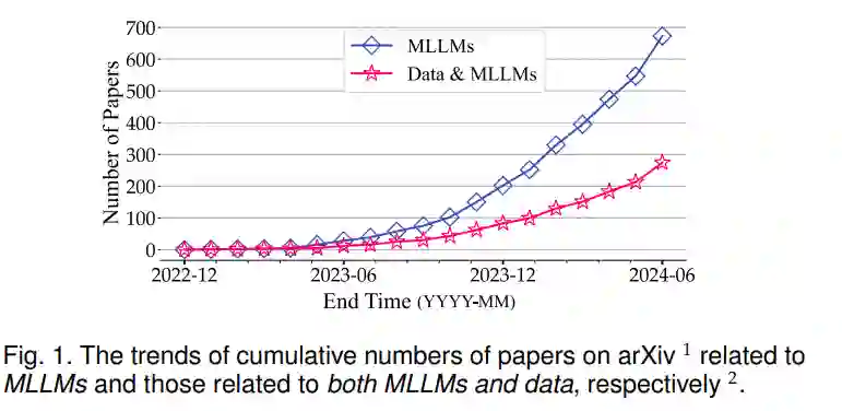 近年来,大型语言模型(LLM)在广泛的任务中展示了令人印象深刻的性能,并且相关技术取得了显著的进展。由于人类的感官不仅限于文本模态,多模态LLM(MLLM)逐渐进入视野,例如能够处理超越文本模态输入或输出的Gemini-1.5 [1] 和 Sora [2],以及能够在输入和输出之间进行多模态交互的GPT-4o [3] 和 NExT-GPT [4]。在过去两年中,MLLM受到广泛关注。正如图1所示,自2023年初以来,与MLLM相关的研究正在以越来越快的速度涌现。 MLLM的卓越性能源于LLM在参数数量扩大带来的解决一系列任务的突现能力[5]。许多研究表明,扩大模型规模需要更加海量的数据来补充[6], [7], [8],例如扩展法则[9], [10]。具体而言,研究表明,多模态模型需要指数级更多的数据才能在下游任务中实现线性零样本改进[11]。鉴于此,一系列工作将重点从仅仅关注模型架构和训练技术转移到数据中心方法,专注于高质量数据的策划[12], [13], [14], [15], [16], [17],以提供进一步释放大型模型潜力的数据基础。从图1可以看出,在现有关注MLLM的论文中,与数据中心方法密切相关的论文也表现出强劲的增长趋势,并占据了重要的部分。 随着与MLLM相关的大量技术工作不断涌现,一些针对MLLM的综述也逐渐出现[18], [19], [20], [21], [22], [23], [24], [25], [26], [27], [28], [29], [30], [31], [32], [33], [34]。这些综述主要从模型中心的角度进行,而数据的重要性需要进一步强调。一项最近的综述将数据中心的视角从单模态扩展到多模态,重点关注现有的数据中心方法,并根据所提出的数据管道阶段进行组织[35]。实际上,数据和模型的发展是交织在一起的,而不是分开的。更大数量和更高质量的数据提高了模型性能,而从高质量数据中受益的良好训练的模型可以进一步改进数据。这减少了人工成本,扩大了数据量,并通过使用需要标注的分割掩码进行训练的Segment Anything模型(SAM)[36]的训练成功展示了这一点。随着SAM在训练中的熟练程度提高,它逐渐取代人在标注任务中的角色,从而形成一个改进模型和数据集的循环。这样的渐进和良性循环促进了MLLM的发展,即受益于高质量数据集的MLLM可以帮助改进训练数据,反过来进一步增强MLLM。 数据-模型共同发展范式很有前途,但尚未得到充分研究。根据我们的调查,目前还缺乏从数据-模型共同发展视角对MLLM的综述。现有综述尚未建立数据中心方法与MLLM能力之间的关系,也没有清晰阐明MLLM的能力如何帮助构建数据集。实现MLLM数据-模型共同发展的关键在于阐明哪些数据方法可以增强每种特定的MLLM能力,以及了解模型可以扮演的角色,以改进多模态数据。因此,本综述旨在通过综合回顾回答以下研究问题,推进MLLM的数据-模型共同发展: * RQ1:在MLLM的生命周期中,哪些数据中心方法可以在哪个阶段用于增强哪些MLLM能力? * RQ2:模型可以扮演哪些角色以促进不同的数据中心方法,并在每种情况下利用模型的哪些特定能力?