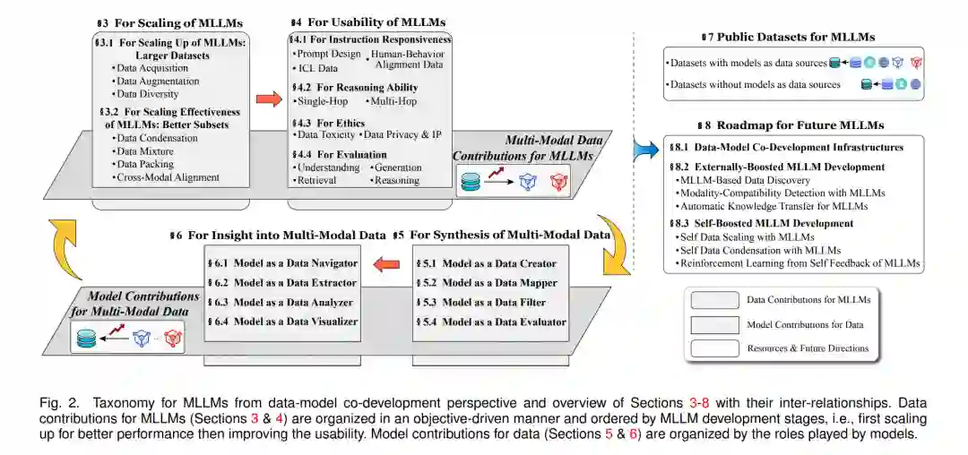 为了回答这两个关键研究问题,我们首先提出一个基于MLLM数据-模型共同发展范式的新分类法。我们将先前的努力分为两个主要类型:数据对模型的贡献和模型对数据的互惠贡献,建立其在MLLM能力中的深层连接。随后,我们从数据-模型共同发展的视角对现有MLLM工作进行全面审查,揭示了推进数据-模型共同发展范式的巨大潜力,主要归因于缺乏对数据和模型之间协同作用的专注。基于获得的见解,我们描绘了若干进步的未来方向,以更好地利用数据和模型之间的互补,从基础设施到各种自我增强程度的数据-模型共同发展。该综述的主要贡献有三点: * MLLM开发的新视角:我们提出了一种新分类法,强调多模态数据与MLLM之间的协同作用,旨在理解和挖掘数据和模型开发的互惠优势。该分类法系统地基于开发MLLM所需的数据相关技术的层次结构进行组织,为研究人员和开发人员提供了推进MLLM的清晰视角。 * 从数据-模型共同发展视角对MLLM的最新综述:我们系统地回顾了快速增长的MLLM工作,阐明1)哪些MLLM能力可以通过特定的数据中心方法增强,2)经过良好训练的模型的能力如何反过来支持数据中心方法。据我们所知,这是第一篇从数据-模型共同发展视角对MLLM进行综述的论文。 * MLLM未来的路线图:我们提供了一个进步组织的路线图,涵盖若干先进和有前途的子方向,重点关注数据和MLLM之间的内部互动。通过这项工作,我们希望为学术研究人员和工业从业者在MLLM不断发展的领域提供灵感和指导。