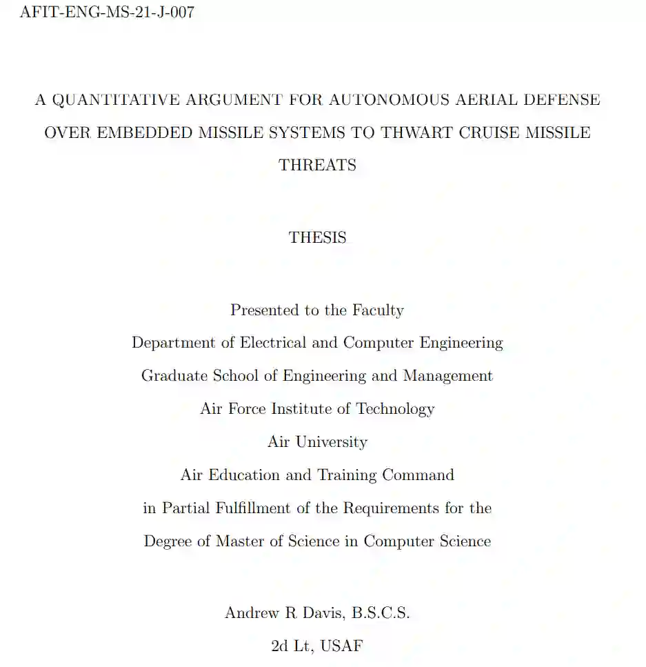 反导研究是美国防部的高度优先事项。由于美国与对手之间的关系日益紧张,而对手有能力压制现有系统并摧毁美国在大国争霸中至关重要的空军基地。对手有能力摧毁导弹防御系统,而维护和部署这些系统的成本又很高,因此有必要对新型导弹防御系统进行研究。具体来说,重点研究自主空中防御导弹系统(AADAM)。该系统测试了一种概念性的、成本相对较低的导弹防御系统的可行性,该系统采用小型无人驾驶飞行器(UAV)来替代现有的和其他建议的手段,如导弹和高能武器。该系统与模拟的 “爱国者 ”系统进行了对比测试。AADAM 系统不是要完全取代现有的导弹防御系统,而是要作为针对巡航导弹威胁的分层导弹防御系统的补充。与现有的导弹防御系统相比,AADAM 系统允许使用灵活且可重复使用的导弹拦截器,从而有可能在整个系统中拦截更多的导弹。结果表明,AADAM 系统是一种可与分层巡航导弹防御系统相媲美的系统。