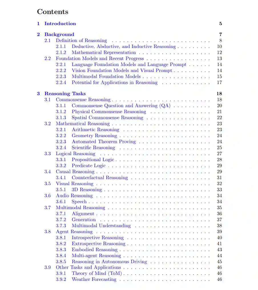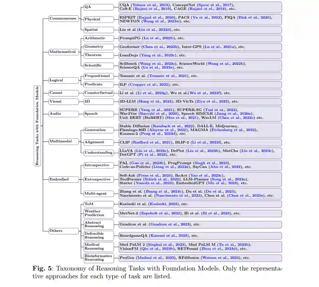 与目前主要关注基础模型特定方面的综述相比,如提示(Qiao et al., 2022)、幻觉(Rawte et al., 2023)、演绎推理(Huang and Chang, 2022)、逻辑推理(Friedman, 2023a; Yang et al., 2023f)、因果推理(Kıcıman et al., 2023; Stolfo et al., 2022)、健康信息学(Qiu et al., 2023a)或AI代理(Xi et al., 2023),本文采取了更广泛的视角,旨在以连贯和有组织的方式连接这一领域的各种研究工作。如图2所示,我们提供了各种推理任务的简洁概述,包括常识推理、数学推理、逻辑推理、因果推理、视觉推理、音频推理、多模态推理、具身推理、可反驳推理等。通过这样做,我们提供了一个全面的概览,突出显示不同领域间的相互联系和关系,以激发更多研究工作积极参与并推进基于基础模型的推理。