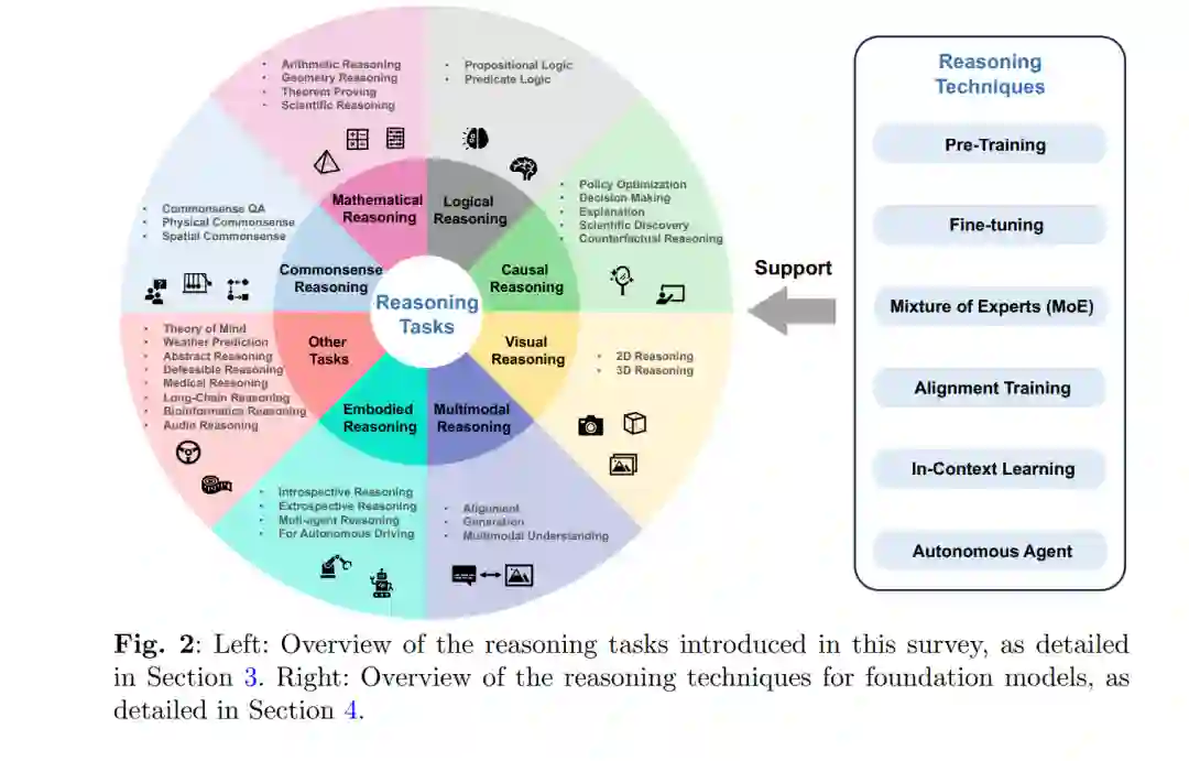 在这一部分中,我们提供了各种推理任务的简明概述,如图2所示。在这里,我们呈现了不同类别的推理方法和任务: * 常识推理(第3.1节):探索推断和应用日常直觉知识的能力。 * 数学推理(第3.2节):专注于解决数学问题和得出逻辑结论的能力。 * 逻辑推理(第3.3节):检验基于形式逻辑进行推理和做出决策的过程。 * 因果推理(第3.4节):调查理解因果关系及其影响的能力。 * 多模态推理(第3.7节):涉及跨多种数据模态(如文本、图像和感官信息)的推理。 * 视觉推理(第3.5节):专注于需要解释和操作视觉数据的任务。 * 实体推理(第3.8节):探索与环境互动的实体代理的推理背景。 * 其他推理任务(第3.9节):推理的讨论跨越各种背景,包括概念框架,如抽象推理3.9.7,可反驳推理3.9.8,以及应用领域,如医学推理3.9.3,生物信息学推理3.9.4等。