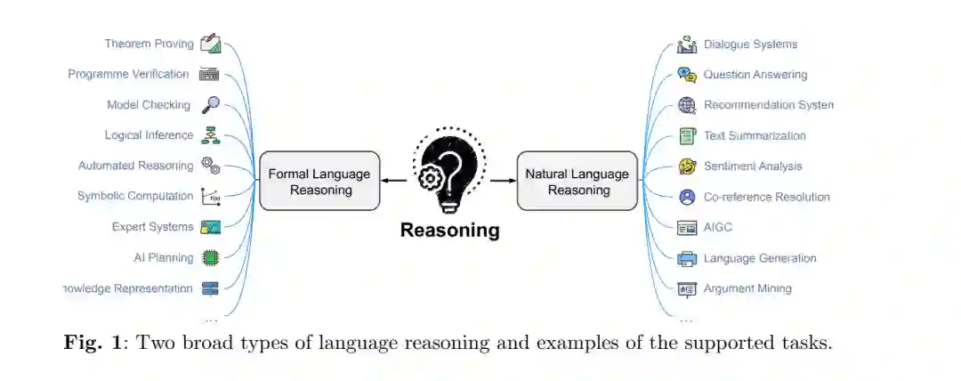 推理是人工智能的一个重要方面,应用范围广泛,涉及问题解决、定理证明、决策制定和机器人技术等领域(Manning, 2022)。《快思慢想》(Daniel, 2017)阐述了人类思维的双系统框架,包括“系统1”和“系统2”两种思维模式。“系统1”运作迅速,依赖于本能、情感、直觉和无意识过程。相反,“系统2”运作较慢,涉及有意识的思考,如算法推理、逻辑分析和数学能力。推理作为“系统2”的关键功能之一发挥着至关重要的作用(Bengio, 2017; Weston and Sukhbaatar, 2023)。推理可以分为两大类:形式语言推理和自然语言推理(Reiter, 1975; Berzonsky, 1978; Teig and Scherer, 2016; Yu et al., 2023a; Zhao et al., 2023b; Li et al., 2023u)。一方面,如图1所示,形式语言推理通常用于软件和硬件系统的形式验证、定理证明和自动推理等领域(Reiter, 1975; Berzonsky, 1978)。另一方面,自然语言推理使人机交互更加直观,并支持诸如问答(Shao et al., 2023; Jiang et al., 2021c)、信息检索(Zhu et al., 2023d; Ai et al., 2023)、文本摘要(Liu et al., 2023n)和情感分析(Yu et al., 2023a; Araci, 2019; Barbieri et al., 2021)等任务。