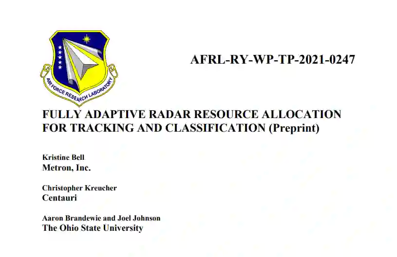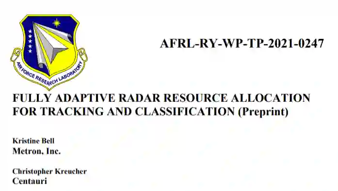 现代数字雷达在其波形、雷达参数设置和传输方案方面提供了前所未有的灵活性,以支持多种雷达系统目标,包括目标探测、跟踪、分类和其他功能。这种灵活性为提高系统性能提供了潜力,但需要一个闭环感知和响应方法来实现这种潜力。完全自适应雷达(FAR),也被称为认知雷达,是模仿认知的感知-行动周期(PAC),以这种闭环方式适应雷达传感器。在这项工作中,我们将FAR概念应用于雷达资源分配(RRA)问题,以决定如何将有限的雷达资源如时间、带宽和天线波束宽度分配给多个相互竞争的雷达系统任务,并决定每个任务的传输参数,使雷达资源得到有效利用,系统性能得到优化。