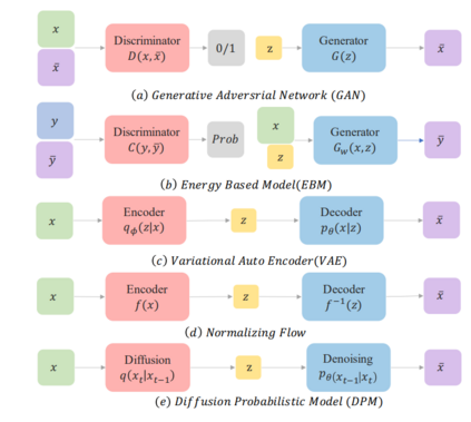 图1所示。在这个图中,我们为每一类生成模型提供了一个直观的机制。(a) 生成式对抗网络(Generative Adversarial Net, GAN)[44]在生成器上运用了对抗训练策略,使其生成的样本不能被真假鉴别器和先验鉴别器区分。(b) 基于能量的模型(EBM)[45]以类似的方式训练,它找到一个由softmax鉴别器和先验输入发生器组成的合适的能量函数,这样它可以输出随机输入的最佳匹配样本。(c) 变分自动编码器(VAE)[46]应用编码器将先验投影到一个潜在空间,从中解码器可以采样。(d) 归一化流量(NF)[29]采用了一个设计良好的可逆流量函数,将输入转化为潜在变量,然后用流量函数的倒数返回样本。(e) 扩散模型逐渐向原始数据注入噪声,直到转向已知的噪声分布,再对采样步骤中的每一步进行反转。