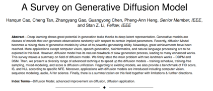 A Survey on Generative Diffusion Model Hanqun Cao, Cheng Tan, Zhangyang Gao, Guangyong Chen, Pheng-Ann Heng, Senior Member, IEEE, and Stan Z. Li, Fellow, IEEE 由于深度潜在表示,深度学习在生成任务中显示出巨大的潜力。生成模型是一类可以根据某些隐含参数随机生成观察结果的模型。近年来,扩散模型以其强大的生成能力成为生成模型的一个新兴门类。如今,已经取得了巨大的成就。除了计算机视觉、语音生成、生物信息学和自然语言处理外,该领域还将探索更多的应用。然而,扩散模型有其生成过程缓慢的天然缺陷,导致许多改进的工作。本文对扩散模型的研究领域进行了综述。我们首先阐述两项标志性工作的主要问题,DDPM及DSM。然后,我们提出了一系列先进的技术来加速扩散模型——训练计划、无训练采样、混合建模以及得分与扩散的统一。对于现有的模型,我们还根据具体的NFE提供了FID score, IS, NLL的基准。此外,还介绍了扩散模型的应用,包括计算机视觉、序列建模、音频、科学人工智能等。最后,对该领域的研究现状进行了总结,指出了研究的局限性和进一步的研究方向。