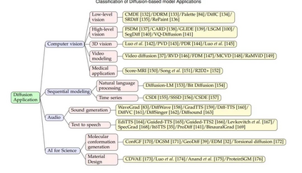 提供关于扩散模型在计算机视觉、自然语言处理、生物信息学和语音处理方面的应用的广泛陈述,包括领域专用问题公式、相关数据集、评估指标、下游任务以及基准集。