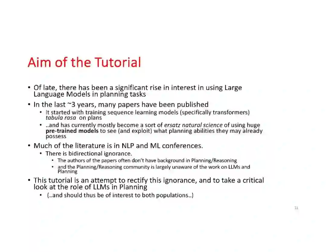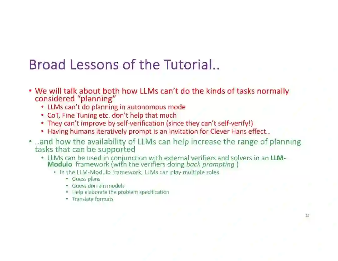 本教程将指出LLMs在生成通常需要通过组合搜索解决子目标交互的计划时的根本限制,并展示LLMs作为补充技术与AI规划社区开发的可靠规划器的建设性用途。除了介绍我们在这一领域的工作,我们还提供了许多相关努力的批判性综述,包括规划社区之外的研究人员的工作。 The preliminary list of topics to be covered in this tutorial includes: 1. Background on LLMs, and patterns of LLM use–including prompting techniques 1. Differentiating the use of transformer architectures vs. Pre-trained LLMs in planning