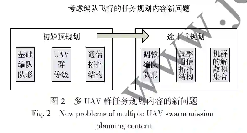 为了让无人机集群能在实际中更好地运用, 从无人机任务规划和编队飞行两个视角进行综述, 再基于编队飞行对多无人机集群的任务规划提出展望. 在无人机群任务规划的研究现状中, 先分成任务分配和航迹规划两部分, 再归纳合并为任务规划进行讨论; 在无人机群编队飞行的研究现状中, 从编队感知通信和编队控制两部分论述. 讨论了多无人机集群融合任务规划和编队飞行的新研究方向和相关问题, 包含考虑编队飞行的多无人机群航迹规划和考虑编队飞行的多无人机群任务规划.