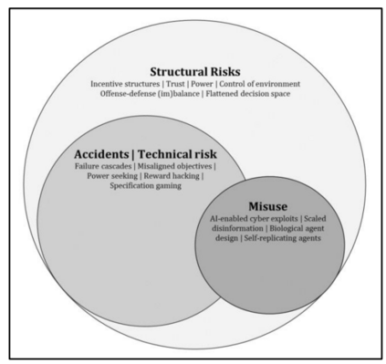 图 1. 人工智能风险格局。事故风险和误用都与自我强化动态有着广泛的重叠。误用人工智能系统会让技术安全问题显现出来,而结构性力量(如经济或地缘政治)会促使未经测试的系统过早发布,改变权力动态(改变攻防平衡),或降低进入门槛。