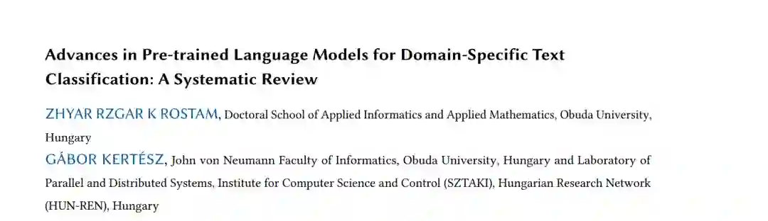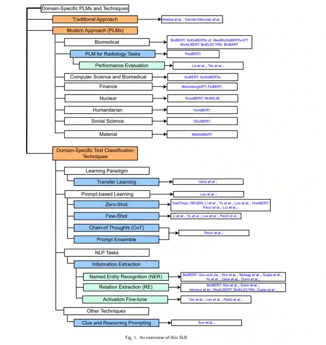 • 探讨预训练语言模型(Pre-trained Language Models, PLMs)在领域特定文本分类中的应用; • 系统分析文本分类技术的演进,重点关注领域特定语境下的最新进展; • 对比传统与现代文本分类方法,特别强调基于Transformer的模型; • 对现有PLM相关研究进行分类,并提出该领域的技术体系化分类法(taxonomy); • 比较LLM在不同领域文本分类任务中的性能表现; • 通过实验分析通用PLM(BERT)与领域特定PLM(SciBERT、BioBERT)在生物医学句子分类中的表现; • 识别领域特定文本分类中的潜在研究方向。