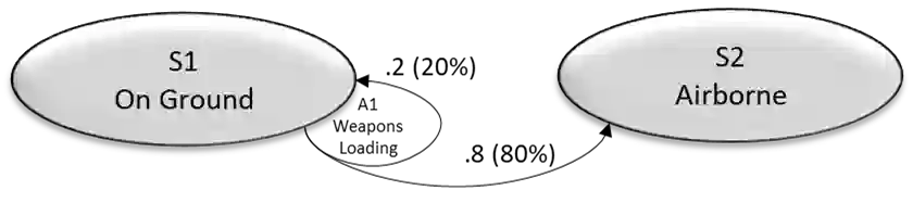 假设状态和子状态未知,分析人员可以利用可观察到的特征来推断飞机当前状态的概率。例如,如果观察到飞机停在机库中,那么飞机处于维护子状态的概率要高于 “准备运行”。如果将这些信息用于预测行为,与状态相关的观察结果的价值就会增加。如果分析员在观察武器装载的历史背景时了解到,之前 80% 的武器装载观察结果导致飞机在 12 小时内起飞,那么我们就可以更有把握地预测飞机将很快过渡到 “空降 ”状态。如图 4 所示,仍有 20% 的几率飞机不准备转场,而是返回维护区或在机场静止不动。