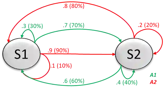 从理论上讲,智能体从一种状态过渡到另一种状态的可能性是由当前状态和智能体下一步能进入哪种状态的概率来预测的。 在下面的例子中,智能体可以存在两种状态: 状态 1(S1)和状态 2(S2)。绿线与行动 1(A1)相关,红线与行动 2(A2)相关。假设在 S1 中使用了 A1。该模型显示,所采取的行动有 30% 的概率会保持在 S1 状态,而有 70% 的概率会进入 S2 状态。因此,如果处于 S1 并采取 A1,智能体很有可能会移动到 S2。