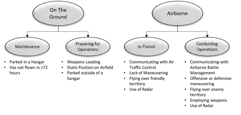 更具体地说,POMDP 可以让分析人员将此模型应用于目标集,如飞机。每个目标都可以被视为一个智能体(一架飞机),能够在多种状态(地面或空中)下运行。在 “地面 ”或 “机载 ”的主要状态下,飞机可以处于以下几种子状态中的任何一种:维护、准备行动、在前往行动区域的途中或正在进行行动。与每个子状态相关的特征可用于深入了解其当前和未来状态。图 3 是这一概念的图解。