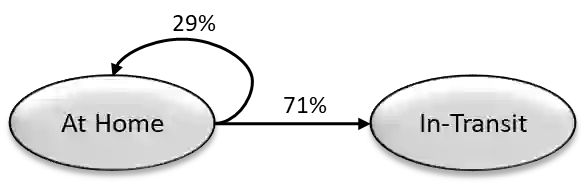 例如,一个人的状态可能是 “在家”、“在途中 ”和 “在工作”。通过了解当前状态,我们可以利用过去的观察结果来确定过渡到新状态的可能性。在一周的观察期内,观察对象在工作日会从 “在家 ”状态过渡到 “在途中 ”状态,而在周末则会保持 “在家 ”状态。如果已知被试处于 “在家 ”状态,我们就可以推断出很有可能发生向 “在途 ”状态的转换,在过去 7 天中有 5 天(71%)都是如此。还有一种较小但明显的概率,即状态不会发生变化,被试仍然 “在家”,这可能是因为今天是周末(29%)。