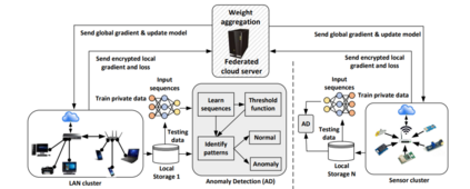 将联邦学习应用于两个分布式集群(局域网和传感器集群)的异常检测。这里N是连接到联邦云服务器的集群数量。每个网络都有自己的测试和训练数据集、本地存储和丢失功能。服务器接收来自所有网络局部模型的各个权值,然后根据它们的可用图属性对它们进行聚合,同时返回全局权值。