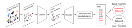 用于异常检测的图自动编码器网络。有两个恶意用户(相当于网络图中的异常节点)连接到网络中。将网络图输入自编码器,计算节点和边缘的重构损失。在这个简单的例子中,只需要将重建损失与一个恒定的阈值进行比较,就可以检测到异常,但是这个过程可以更加先进和精确。
