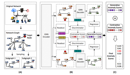 在这个图中,我们已经将SL-GAD[133]框架应用于在2.3节中讨论的LAN概念用例。(A)是图视图采样模块,选择目标节点,对两个子图进行采样。(B)是生成型和对比型辨别模块。首先,将目标节点和两个子图提供给GNN编码器,并创建图嵌入。在下一步,两个不同的目标,鉴别器和回归器试图捕获图结构和属性中的异常。生成回归模块用于捕获每个节点属性中的异常,而鉴别器模块负责发现图结构中的异常。最后,在(C)中,对比分数和生成分数相结合,计算出最终的异常分数。