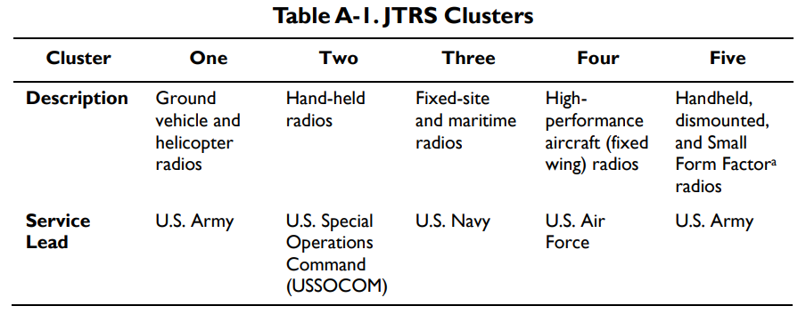 JTRS计划旨在用可在大部分无线电频谱上运行的基于软件的无线电取代军队使用的25至30个系列的无线电系统--其中许多系统不能相互通信。根据设想,JTRS将使各军种与选定的盟国一起,通过各级指挥部的无线语音、视频和数据通信,包括直接获取来自机载和战场传感器的近实时信息,以 "无缝 "方式运作。被描述为 "软件定义的无线电",JTRS的功能更像一台计算机,而不是传统的无线电;例如,它可以通过添加软件而不是重新设计硬件来升级和修改,以便与其他通信系统一起运行--这是一个更昂贵和费时的过程。国防部声称,"在许多情况下,一个具有多种波形的JTRS无线电台可以取代许多单独的无线电台,简化了维护工作",而且由于JTRS是 "软件可编程的,它们也将提供更长的功能寿命",这两个特点都提供了潜在的长期成本节约。JTRS计划最初被分成五个 "集群",每个集群都有一个特定的服务 "领导"(见表A-1),并由一个联合项目办公室管理整个架构。