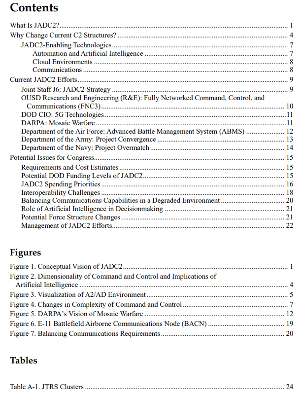 以下各节讨论了国会的潜在问题,包括需求和成本估算、互操作性挑战、平衡通信能力、人工智能在决策中的角色,以及实施JADC2所需的潜在部队结构变化。