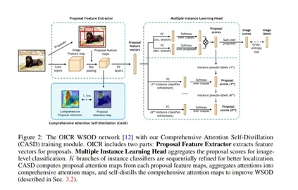 弱监督目标检测(WSOD)已经成为一种仅使用图像级别的类别标签训练目标检测器的有效工具。然而,由于没有目标级标签,WSOD检测器容易检测出显著物体、聚杂物体和判别性物体部分上的标注框。此外,图像级别的类别标签不会强制对同一图像的不同变换进行一致的目标检测。针对上述问题,我们提出了一种针对WSOD的综合注意力自蒸馏(CASD)训练方法。为了平衡各目标实例之间的特征学习,CASD计算同一图像的多个变换和特征层聚合的综合注意力。为了加强对目标的一致空间监督,CASD对WSOD网络进行自蒸馏,通过对同一幅图像的多个变换和特征层同时逼近全面注意力。CASD在标准数据集上如PASCAL VOC 2007/2012和MS-COCO产生了最好的结果。