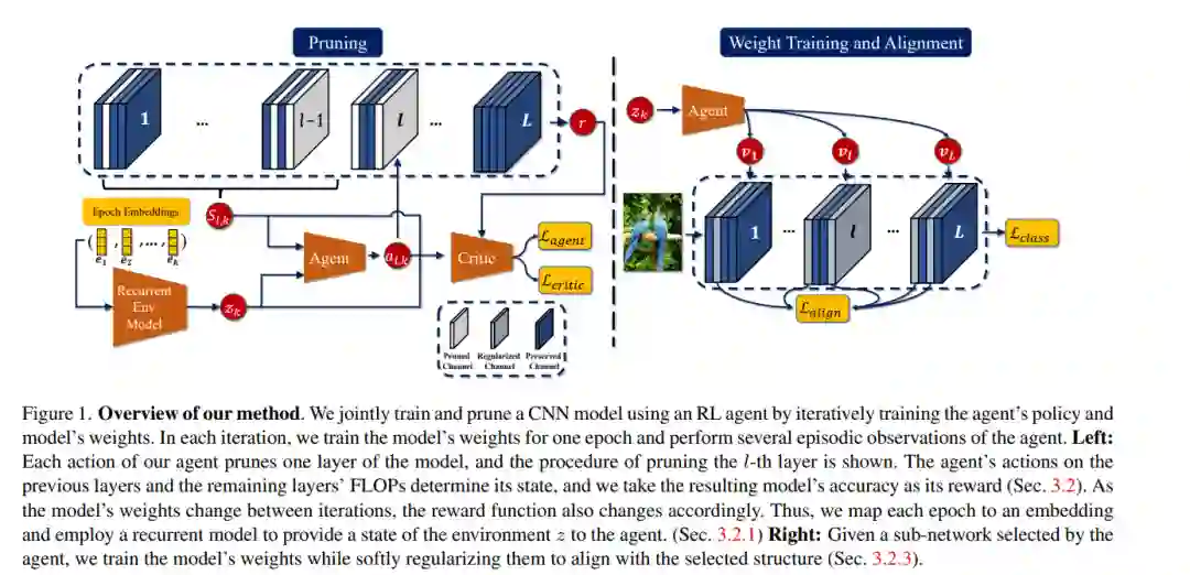 在部署到资源受限设备之前,结构模型剪枝是一种用于减少卷积神经网络(CNNs)计算成本的突出方法。然而,大多数提出的想法在剪枝前需要一个预训练的模型,这是成本高昂的。在本文中,我们提出了一种新颖的结构剪枝方法,用于共同学习权重并结构性地剪枝CNN模型的架构。我们方法的核心元素是一个强化学习(RL)代理,其行动决定了CNN模型层的剪枝比例,而得到的模型准确率作为其奖励。我们通过迭代训练模型的权重和代理的策略来进行联合训练和剪枝,并且我们规范模型的权重以与代理选择的结构对齐。不断演变的模型权重导致了一个动态的奖励函数给代理,这防止了使用假设环境稳定的著名情节性RL方法达到我们的目的。我们通过设计一种机制来解决这一挑战,该机制能够模拟奖励函数复杂变化动态,并将其表示提供给RL代理。为此,我们为每个训练时期取一个可学习的嵌入,并使用递归模型来计算变化环境的表示。我们使用解码器模型训练递归模型和嵌入,以重构观察到的奖励。这样的设计使我们的代理能够有效地利用情节性观察以及环境表示,来学习一个适当的策略,以确定CNN模型的高性能子网络。我们在CIFAR-10和ImageNet上使用ResNets和MobileNets进行的广泛实验展示了我们方法的有效性。