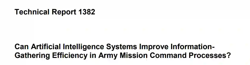 由于传感器数量不断增加,人工智能(AI)的应用也日益广泛,未来作战环境的特点将是信息量大、决策速度快。因此,陆军指挥官及其参谋人员将需要更快地做出决策和筛选大量信息的能力。商用人工智能系统具有提供这种能力的潜力,但陆军不能假设 "开箱即用 "的商用人工智能系统具有全部能力,因为这些系统需要针对美国陆军的具体情况进行充分的训练。此外,还需要开展研究,以了解目前人工智能在陆军中的应用情况。总的来说,人工智能往往擅长于主要通过模式识别来解决的任务,以及可以通过任务数据进行预测的任务,如图像识别、医疗诊断和转录。然而,人工智能能否用于提高美国陆军的信息收集效率,目前还不得而知。因此,在当前的研究中,探讨了以下问题: 人工智能能否用于提高美国陆军任务式指挥流程中的信息收集效率?