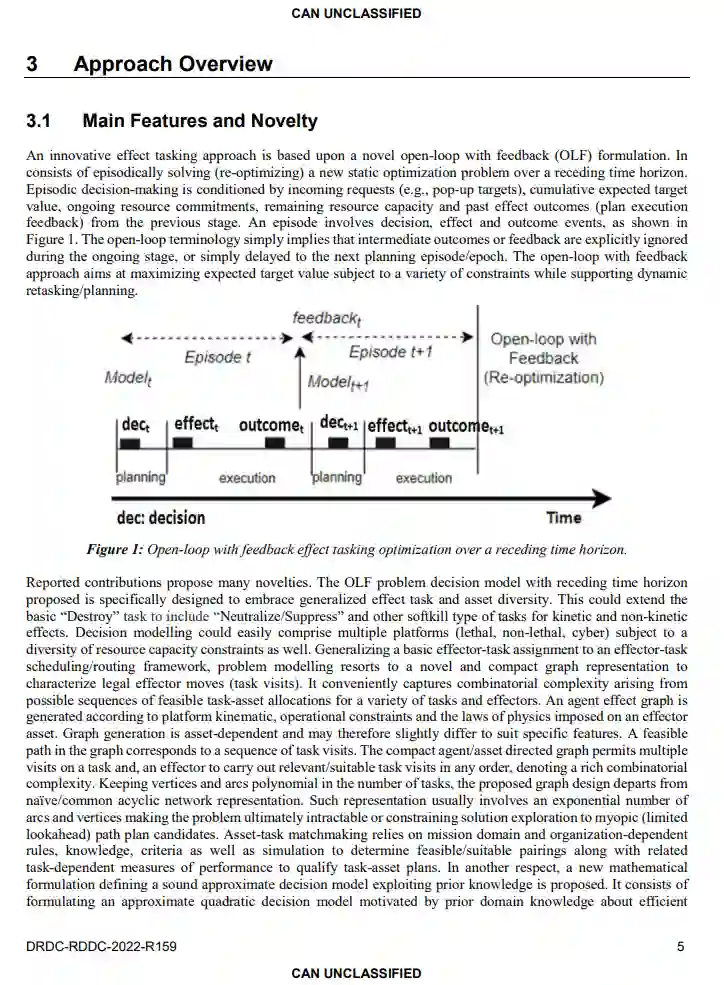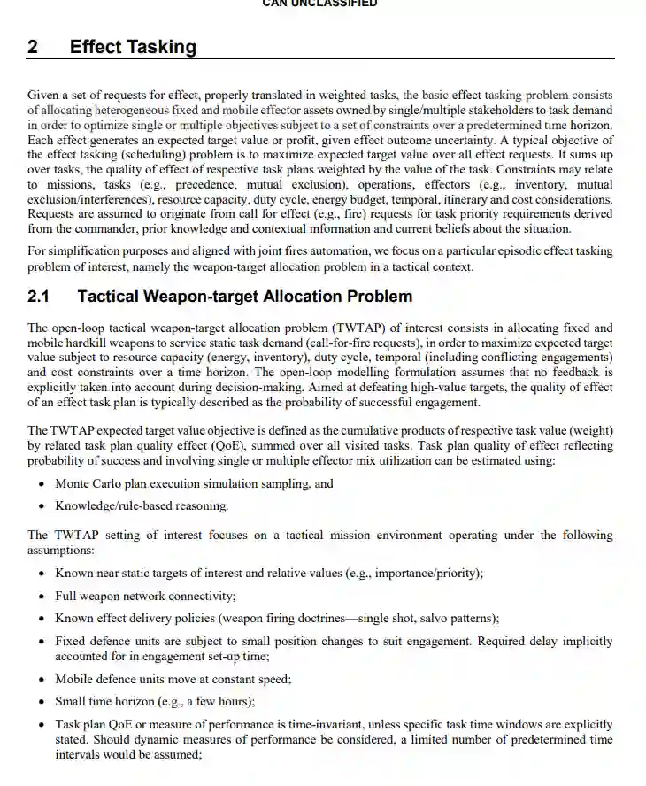 本科学报告提出了新的效应任务决策支持技术概念,为支持战术联合火力的数字化指挥与控制(C2)解决方案铺平了道路。这些新概念完全符合加拿大陆军陆军需求局(DLR)2的意图,即实现战术决策-行动周期的自动化和优化。这项工作旨在及时向DLR2和联合火力现代化资本采购项目的定义阶段通报战术边缘新的自动化和优化效应任务技术概念,并确定有希望的研究方向。新的预先规划概念为敏感瞄准、动态效应任务/再任务、效应器整合以及新的自动化非近视效应任务解决方案的可行性和价值带来了不同的视角。这种方法构成了对科学和技术的创新贡献,最终推荐了具有接近最佳传感器效应任务解决方案的使能者。拟议的核心概念计划在适当的国家和国际场所,如关键的选定的军事演习和/或技术合作计划(TTCP),逐步和有机会地展示。这将为其他 "五眼 "国家提供所需的能见度,并为适当的验证提供机会窗口,同时获得对加拿大感兴趣的有竞争力的最新技术。