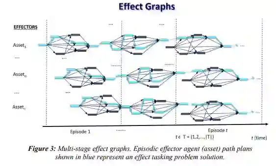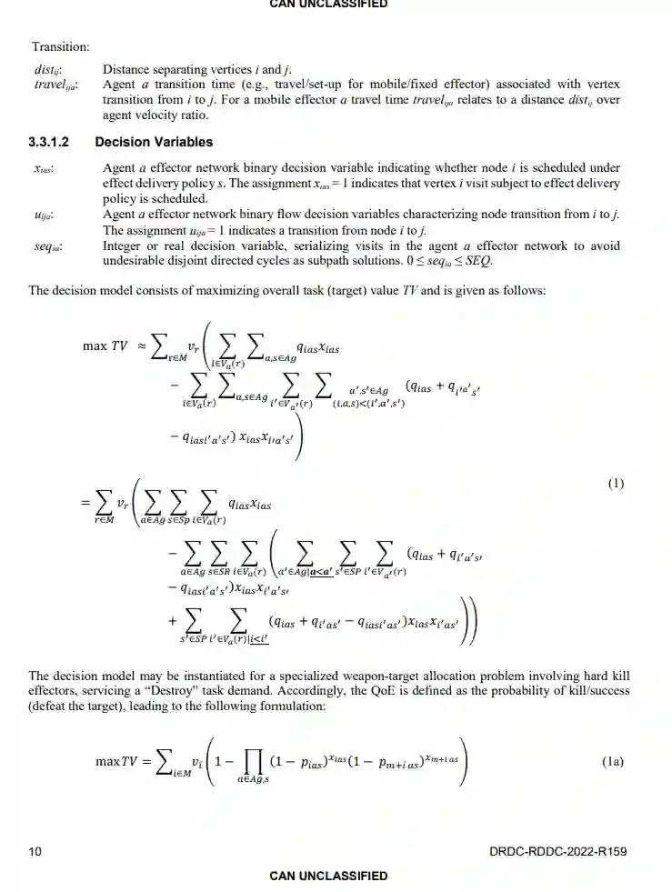 目前的效应任务分配方法经常考虑到基本的资产-任务分配,假设在有限的资源能力限制下进行同步交战。然而,故意忽略由时间限制或交战顺序/序列可行性驱动的战术复杂性可能会导致实践中的解决方案不可行。在这份科学报告中,提出了一种适应复杂战术武器-目标分配问题设置的创新效应任务分配方法。它定义了一个新的开环反馈调度决策模型问题表述,旨在异步分配n个效应器为m个任务/目标提供服务,以使预期任务(失败)值最大化,但要遵守资源能力和边际约束,时间范围不断缩小。因此,我们提出了一个新的近似二次规划决策模型。它受传入请求、累积预期目标值、正在进行的资源承诺、剩余资源能力和前一阶段的计划执行反馈的制约。该方法采用了一种新的紧凑的效应图表示,以方便地捕捉可行的效应器路径计划。借用典型的高质量解决方案,近似决策模型特意限制了一个任务的访问次数,大大减少了搜索空间的探索。所提出的数学公式也有利于自然利用权威的商业优化工具,在运行时提供有价值的优化差距信息,以便有效地指导问题的解决和减少计算。
