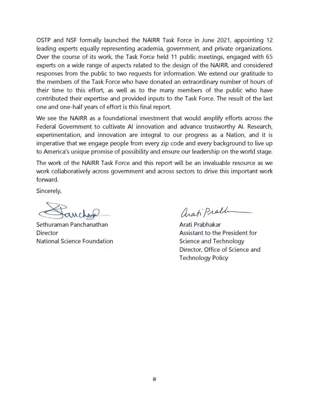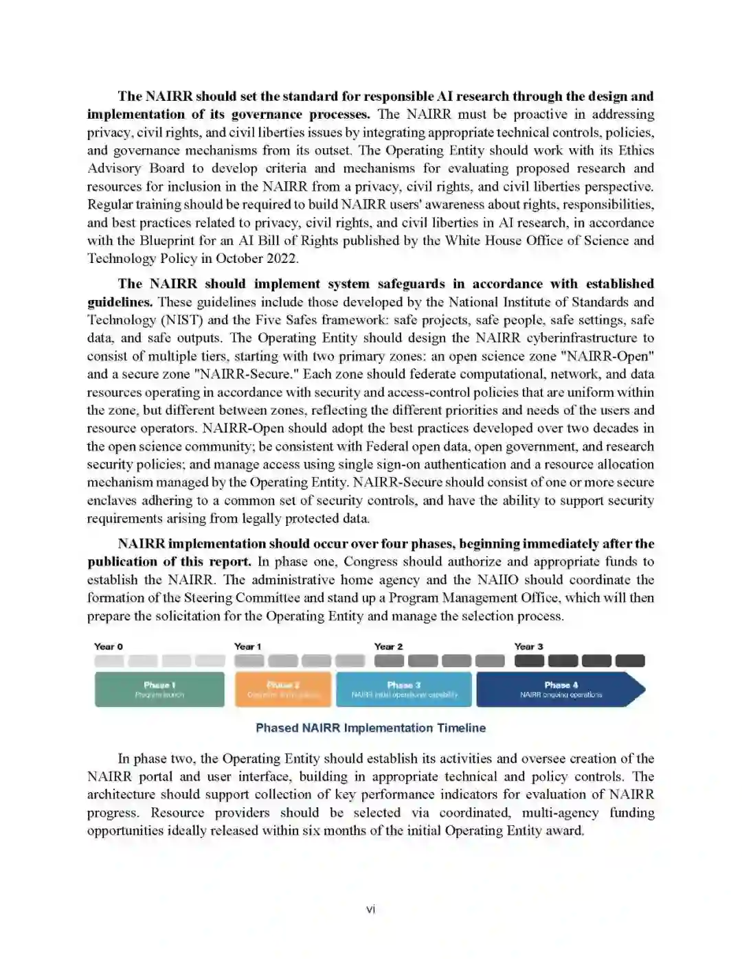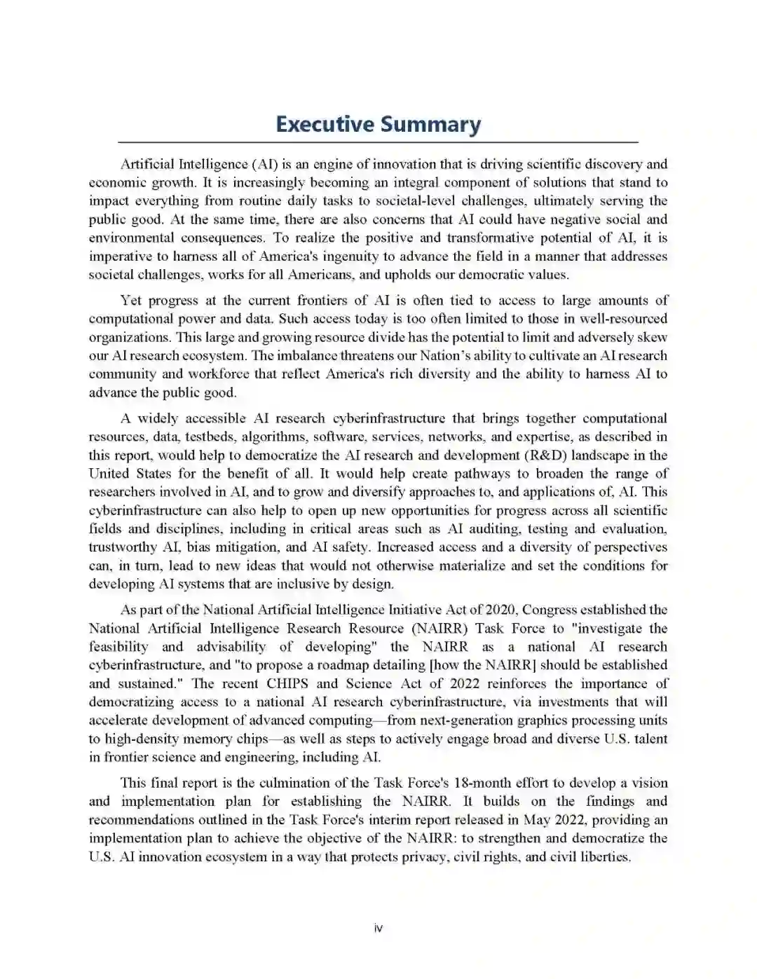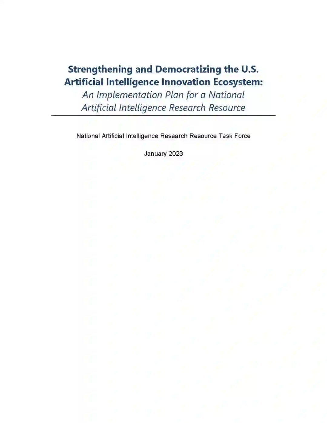 作为2020年国家AI倡议法案的一部分,国会建立了国家AI研究资源(NAIRR)工作组研究发展“NAIRR”作为国家AI研究的可行性和可取性网络基础设施,并“提出一个路线图,详细说明应该如何建立NAIRR”持续有效。最近的2022年芯片和科学法案强调了通过投资实现国家人工智能研究网络基础设施的民主化,从下一代图形处理器(GPU),加速高级计算的开发到高密度内存芯片——以及积极吸引广泛多样的美国人才的措施在前沿科学和工程领域,包括人工智能。